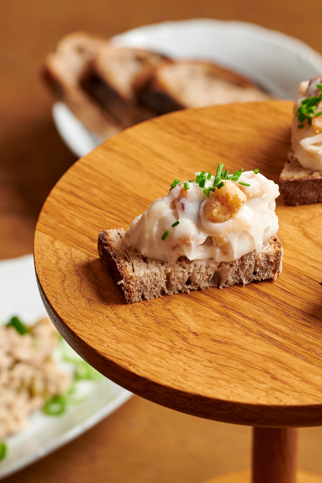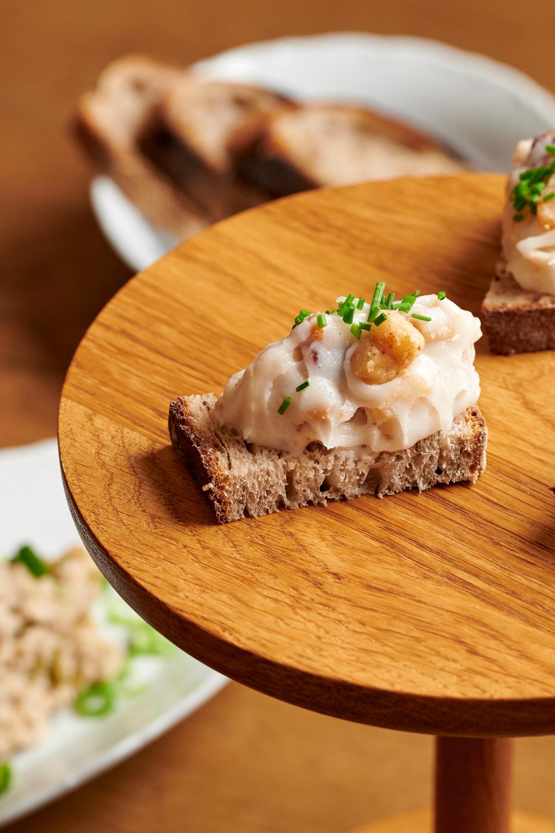 🍿 Crackling popcorn in a bowl + amuse bouche (bread + egg spread + crackling)