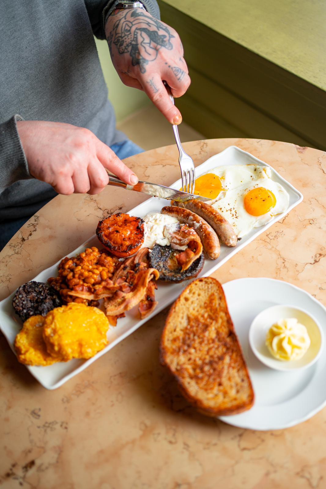 🍖 Full English Breakfast (egg, beans, black pudding, salsiccia, bacon, portobello, tomato, potato pancake, bread, butter, whipped feta)